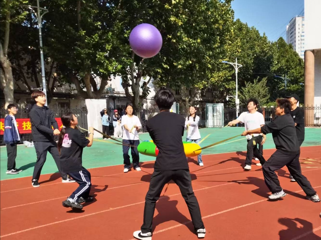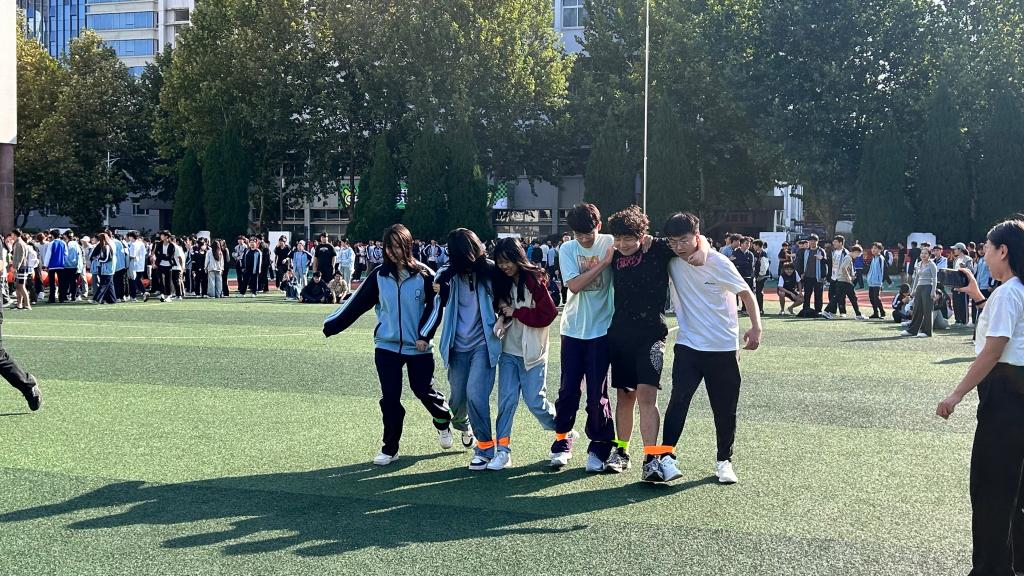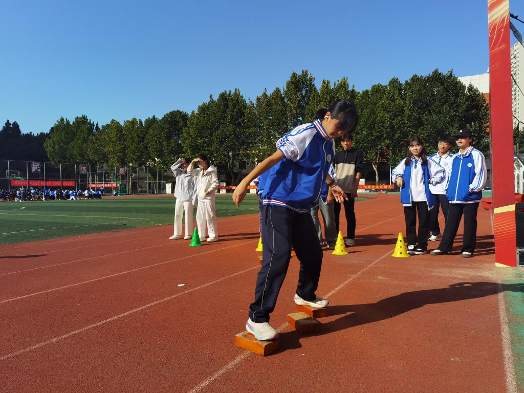 赛场上参赛选手们挥汗如雨,赛场边不时爆发出热烈的掌声与喝彩。在摸石过河项目中,通过一次次接力,队员们不断为队友出谋划策,改进前进方式,小小的砖块是他们前行的垫脚石。毛毛虫竞速、绑腿跑项目中,参赛队伍全神贯注、配合默契,队员们向着共同的目标——终点冲刺时,协作的快乐在前进的过程中蔓延开来。众星捧月项目中,队员们齐心协力驾驭着蹦蹦球,有的接连弹跳,有的不断落地,团队的鼓励与个人的拼搏在这一刻展现。拔河比赛将现场气氛推向最高潮,这不仅是队伍间力量的碰撞,也是班级凝聚力直接的体现,整齐划一的口号响彻云霄,欢呼声、呐喊声此起彼伏,同学们的手攥紧麻绳,拼尽全力向后拖拽,上演力量的拉锯战。队员手中紧握的,是班级的荣誉,更是青春的重量。
