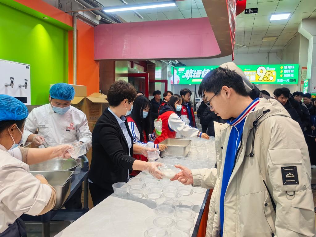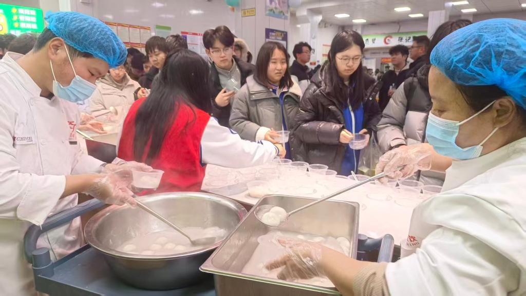 活动现场热闹非凡,窗口前排起的长龙,是同学们对这份甜蜜期待最生动的注脚,张张笑脸洋溢着喜悦。为了让这份温暖第一时间抵达心间,餐厅后勤工作人员与学生志愿者系上围裙,化身“暖心大厨”,当一份份热气腾腾的元宵递到同学们手中,伴随的是志愿者们一句句真诚的祝福——“同学,元宵节快乐!”刹那间,元宵的甜香与节日的浓情,在餐厅的每一个角落弥漫、交融。